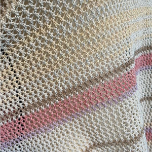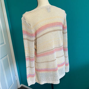 This beautiful open knit sweater is made by Chico's. This sweater is cream colored with pink and brown stripes. This sweater has a boatneck style with side split for comfort and long sleeves. In great condition, no visible flaws. Made in Vietnam, Chico's size 3, US XL.