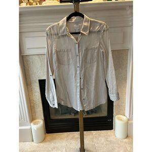 Chico’s Women’s Cream and Gold Striped Collared Bottom Up Long Sleeve Shirt Size 0 /XS Preowned in excellent condition.