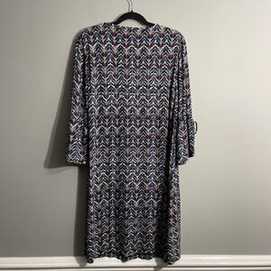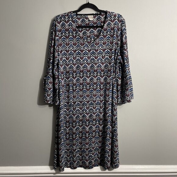 Chico’s Women’s Dress 3 Slit Bell Sleeve Jersey Knit Chevron Print 16/18