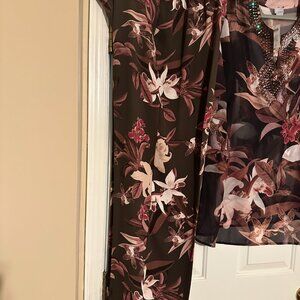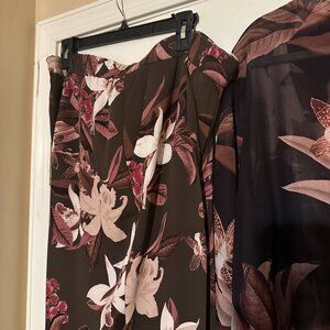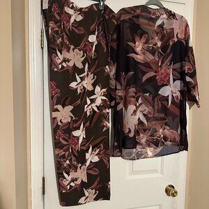 This Chico's tunic and pant set in women's size 3 (16, XL) features a floral pattern with embellishments of beaded and sequin accents. The long sleeve tunic has a V-neckline and is made of polyester material. Perfect for a stylish outfit for any occasion, this set is designed for women looking for a chic and comfortable ensemble. Stored in a smoke free environment.