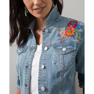 Chico's Women's Embroidered Floral Jean Jacket Shacket Stretch Welt/Chest Pockets Plus Size