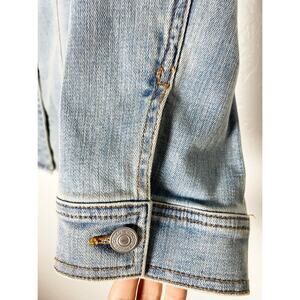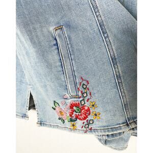 Chico's Womens Embroidered Floral Jean Jacket Shacket Stretch Welt/Chest Pockets