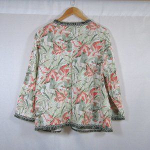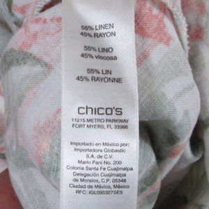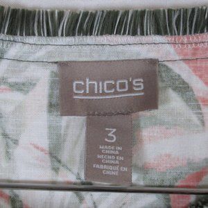 Chico’s Womens Floral Linen Blazer w\ Frindge Accents Sz XL/3 Pre-owned Good. Fringe Embroidered Trim. Floral Print Pastel: Salmon Green White. Lightweight. Perfect for those summer evening outings.