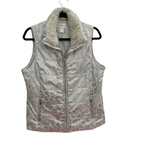Chicos Women’s Full Zip Gray Vest Size 1 (Medium) Zip Pockets Faux Fur Collar