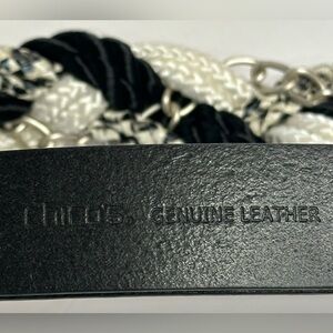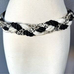 Stylish black and white braided belt with silver accents. Perfect for adding a chic touch to any outfit.