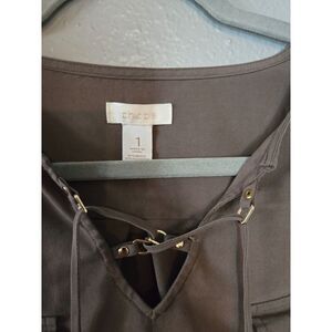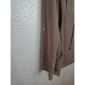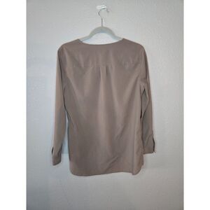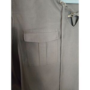 Chico's Women's Green Long Sleeve Blouse. 2 Front Pockets. Tie Neck. Buttons to cuff sleeves. Gold Hardware. Color is Army Green - Greenish Brown. 63% Model; 23% Polyester; 4% Spandex. Soft and Lightweight. Workwear. Casual. Chic. Fall. Size 1. Excellent Used Condition.