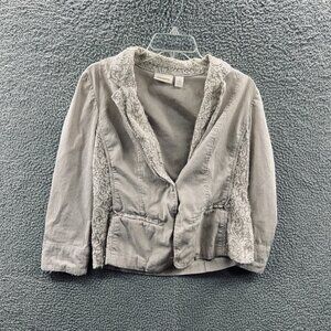 Romantic and functional, this Chico’s women’s medium jacket blends cottagecore charm with everyday versatility. Featuring delicate lace trim, a utility-inspired design, and a flattering button-front silhouette, it’s perfect for layering over dresses or pairing with jeans.