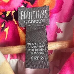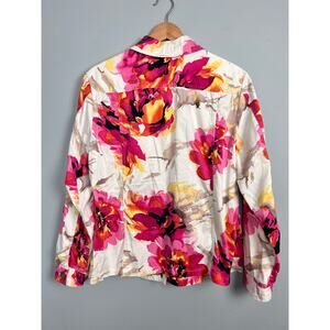 A vibrant piece of wearable art from Additions by Chico's, this jacket is perfect for adding a pop of color to your wardrobe. It features a bold, painterly floral print in stunning shades of pink, yellow, and orange. Crafted from a comfortable stretch-cotton fabric with a tailored fit, this is a perfect statement piece for spring, summer, or your next vacation.