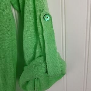 Chicos Womens Linen Open Cardigan Sweater Size 1 Medium Long Line Roll Tab Green