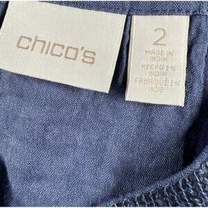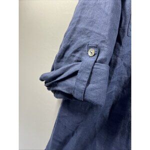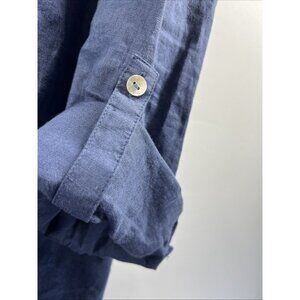Chicos Women's Linen Top Large Navy Blue Roll Tab Long Sleeves Sequin Button Up