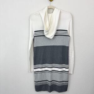 Chico's Womens Long Cardigan Hooded Sweater Size S Striped Neutral Cashmere Gray