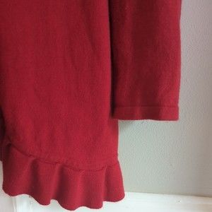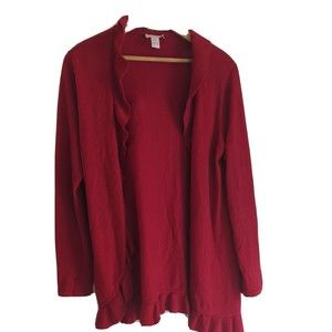 Chico's Women's Long Sleeve Top Size 1 Red Ruffle Open Wrap Drape Shawl Stretch. Length 29.5" Underarm to underarm 23" Cotton, nylon, rabbit hair blend Open Cardigan, long fit With a simple ruffle detail The perfect Fall/Winter sweater Soft with a light stretch to it Perfect for layering