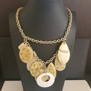 Chico's statement necklace has gold and white pieces hanging from the gold tone chain. 19 inches long.