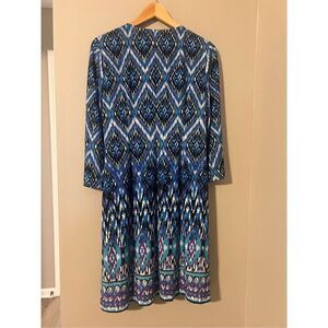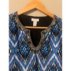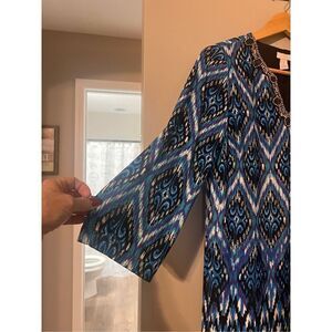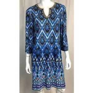 Chicos Women's M Beaded Neck Shift Dress Blue Purple Ikat Geometric Print Bold