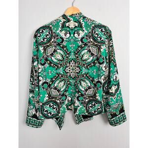 A stunning "Art to Wear" blazer from Chico's, perfect for making a vibrant statement. This jacket features a bold and intricate paisley medallion print in a gorgeous green, black, and white colorway. The elegant open-front design with a draping waterfall lapel and lightweight, flowy fabric make this the perfect piece to elevate any career or casual outfit.