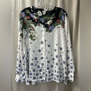 Elegant Chico's blouse featuring a vibrant floral pattern. Includes shades of blue, red, and green on a black background. No longer made with this stunning design
