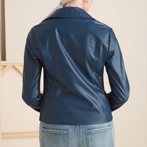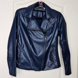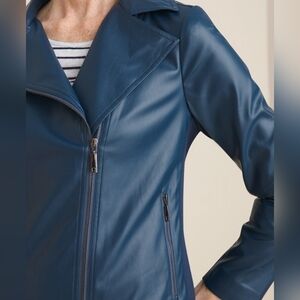 Chico's Women's Navy Blue Faux Leather Jacket with Knit Panels Butter Soft 4/6