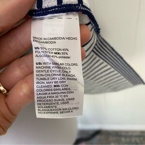 The Chicos Women's Navy White Striped Pullover Top Tunic Knit in size XL is a stylish and versatile sweater perfect for casual occasions. Made from a comfortable cotton blend knit fabric, this top features a V-neckline, short sleeves, and a relaxed fit. The classic navy and white striped pattern adds a modern touch, making it suitable for all seasons and perfect for layering in fall, spring, and winter. Machine washable for easy care, this pullover top from Chico's is a must-have addition to any woman's wardrobe.
