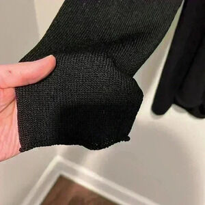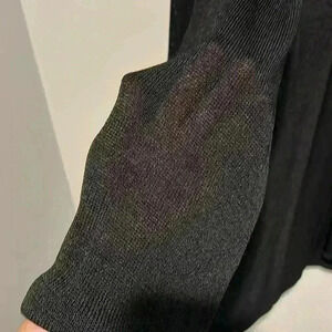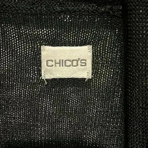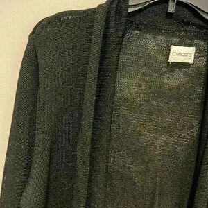 I am estimating that this is a women's size Large, probably Chico's size 2. Long sleeves, open front. Hear me on this though- I don't know what this is made of but the knit is extremely heavy- the sweater weighs almost 1.5 lbs, yet is see-through. It's very interesting and a great piece for a staple wardrobe. In great condition. Dark black with no fading.