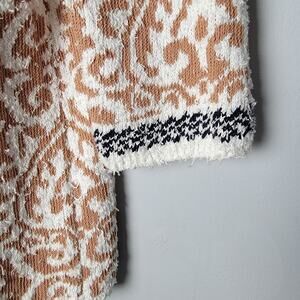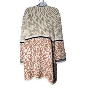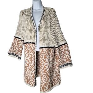 Beautiful Chico’s open-front cardigan featuring a unique mixed pattern design — animal-inspired stripes on top and ornate damask-style florals on the bottom. Warm neutral tones in beige, cream, and brown with black accents, plus gold metallic threads throughout for a subtle sparkle. A statement layering piece that’s both cozy and stylish.