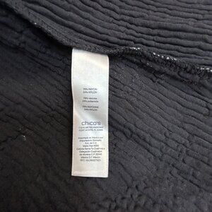 This Chico’s open front jacket blends casual elegance with rich texture, featuring a velvet burnout floral pattern in black and beige tones. It offers a relaxed fit, long sleeves, and a lightweight drape—perfect for layering over tanks, blouses, or dresses for a boho-chic look.