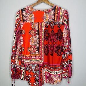 Chicos Womens Patched Paisley Peasant Top Red Size 1 Or Small New Without Tags armpit to armpit 21 inches length 27.5 inches sleeve 23 inches beautiful blouse.