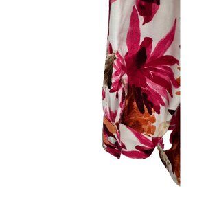 This Chico's Women's Pink Floral Collared Button-Up features roll tab sleeves, a size 1 US M. Its vibrant print and comfortable fit make it an ideal choice for casual or professional wear.