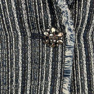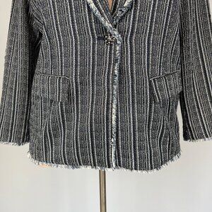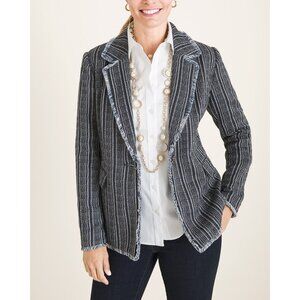 Chico’s blue striped tweed fringe single-button blazer
