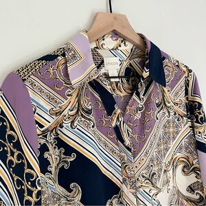 Chico’s women’s printed crisscross hem tunic in purple, yellow and gold colors. Chico’s size 1, which is a size medium or 8.