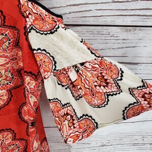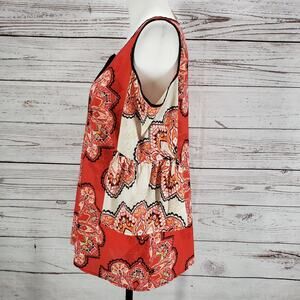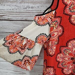 Chico's -Women's Red Tiled Spice Cold Shoulder Top Size 1. 100%Polyester. Approx. measurements pit to pit 19.5 in. Top length 27 in. Pre-owned in good condition, no holes or stain.