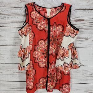 Chico's Women's Red Tiled Spice Cold Shoulder Top Size 1