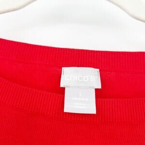 Chicos Womens Romantic Valentines Day Knit Floating Hearts Sweater in Red. Size Medium.