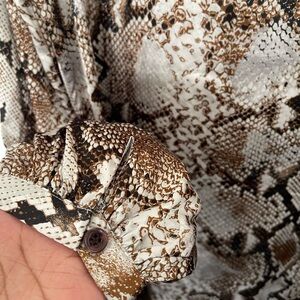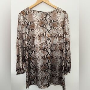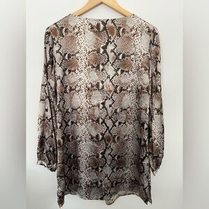 CHICOS brown beige long sleeve python snake print tunic blouse top size 0, 4/6, small. Pullover with round neckline and long sleeves. Made of polyester/spandex blend.