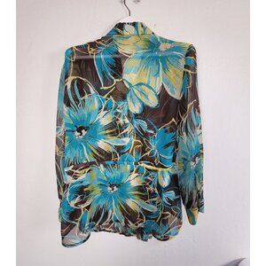 Elevate your wardrobe with this chic Chico's blouse. The vibrant turquoise floral design on sheer silk offers sophistication and comfort for stylish outings.