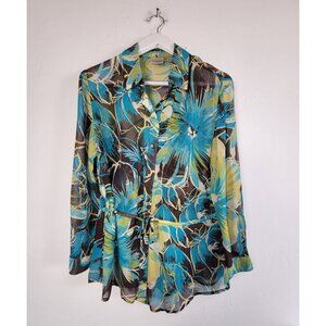 Chico's Women's Sheer Blouse Tunic Long Sleeve Waist Drawstring Floral Size 2