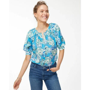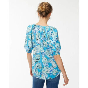Chico's Women's Shell Print Ramie Blend Blouse Size 0.5 or Size 6. This lovely top is gently loved and in remarkable condition, without any flaws. The shell print ramie blend blouse has a soft seasonal look that's perfect for warm weather along the ocean. It features smocked sleeves for easy wear and adds a stylish touch with its voluminous design. Whether you pair it with crops or shorts for beachfront lunches, this satiny, ramie-blend blouse is the ideal choice. Currently sold out online, it originally retails for $109. However, I'm open to reasonable offers if you'd like to make it yours. Oh, and I have a little something extra for you! If you're interested in more than one item, we offer a fantastic 15% discount. So, why not treat yourself and spruce up your wardrobe with a fabulous bundle? If this sounds appealing to you, just let me know!