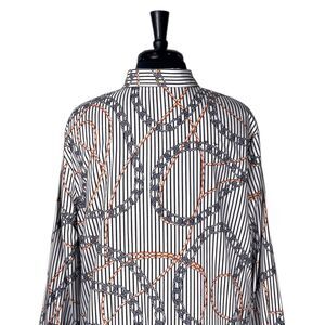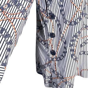 Bold and polished, this Chico’s tunic shirt features a navy and white striped chain-and-rope motif with a chic nautical/equestrian feel. Crafted from a comfortable cotton/spandex stretch blend, it offers an easy, flattering fit with tunic length coverage. Designed with a collared neckline, half button-front placket, long sleeves with one-button cuffs, and three-button side accents for elevated detail.