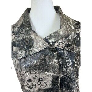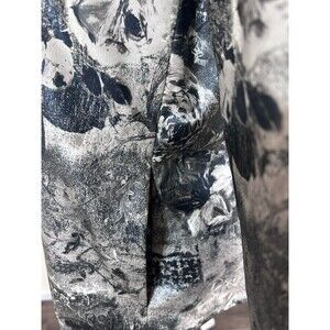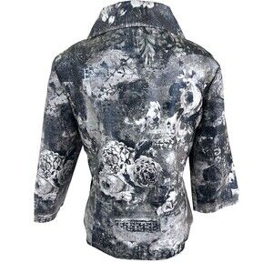 The Chico Womens Size 0 Lined Snap Front Floral Waterproof Jacket is a stylish and functional outerwear piece perfect for a party or business occasion. Made with a cotton/polyester fabric, this 3/4 sleeve jacket features a snap closure and a vibrant floral pattern in black,beige,ivory. The lined interior and water-resistant feature make it comfortable and practical for staying dry in wet weather. With its basic jacket style from a reputable brand like Chico, this jacket is a versatile addition to any woman's wardrobe. The fabric is water proof but not a rain jacket its a dress jacket.