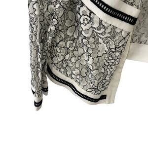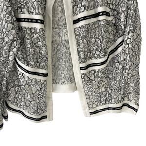 Sheer lace jacket detailed with contrasting thread and entredeux trim—a floral layer you'll love all year long. The jewel neckline and black-and-white palette ensure it's perfect with pearls.