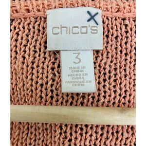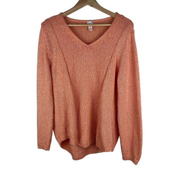 Chico's Women's Size 3 Peach Sequin Cotton Blend V-Neck Pullover Sweater. Pre-owned in very good condition, no rips, holes or stains noted.