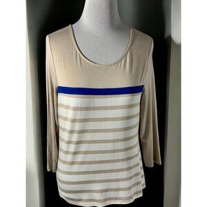 This delightful top from Chico's is an embodiment of casual elegance, featuring a soothing beige hue complemented by striking blue accents. The horizontal stripes add a touch of modern flair to its classic design. Crafted for comfort, its 3/4 sleeves offer a versatile style suited for various occasions.