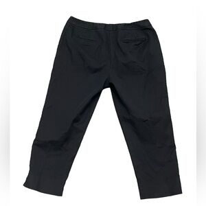 These Chico's straight leg pants in black are the perfect addition to any wardrobe. With a mid-rise waist and zipper closure, they are versatile for any occasion, whether it be travel, casual or formal. Made from a comfortable polyester blend knit fabric, they feature button, zipper, and logo accents, as well as pockets for added convenience. The pants are a size 12, with a waist size of 31 inches and an inseam of 22 inches. The stretch material provides a comfortable fit for regular use.