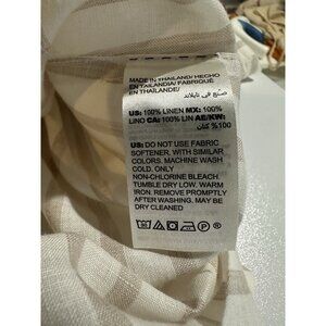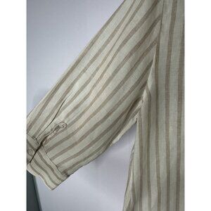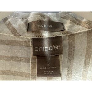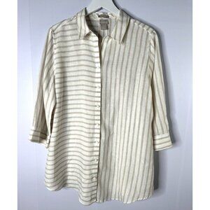 Chicos Womens Sz 2 L Beige Stripe Linen Button Up No Iron Tunic Top 3/4 Sleeve