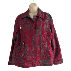 Chicos Women's Sz 2 (Large) Red Gray Abstract Floral Print Snap Front Jacket