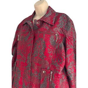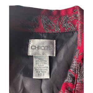 Chico's red and gray abstract print jacket. Jacket has a snap up front with four zippered front pockets. It's made of a cotton lyocell blend with a poly lining. Jacket is a Chico's size 2 which translates to a woman's size large.