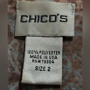 The product is a Chicos Women’s Top Shirt in a size 2 (large) with a tie-dye embellishment featuring a 3/4 bell sleeve, scoop neckline, and slit sleeve closure. Made from polyester, this multicolor blouse is perfect for various occasions, including travel, parties, casual wear, and business events. The lightweight and all-season design of the top offers a bohemian style with beaded accents, making it a versatile and stylish addition to any woman's wardrobe.
