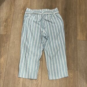 Chico's pants with blue and white stripes. Features a comfortable fit.