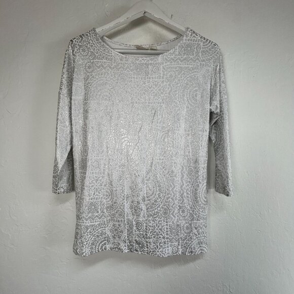 Chico's Womens White Silver Textured 3/4 Sleeve Top Size 1 Stretch 3/4 Sleeve