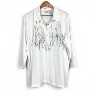 Hit the links in style with this performance polo shirt from the Zenergy Golf collection by Chico's. Designed for comfort and movement, this top is crafted from a smooth, stretchy fabric that's perfect for a day on the course. The crisp white polo is elevated with an abstract artistic print, accented with subtle studs for a touch of sparkle.