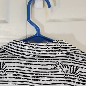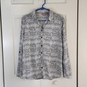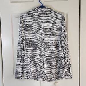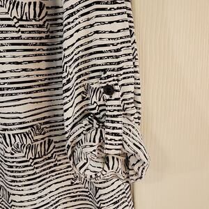 Super cute shirt by Chico's. Button front &cuffs. Black & white stripes with zebra print. Fold down collar. Very lightweight & flowy. EUC